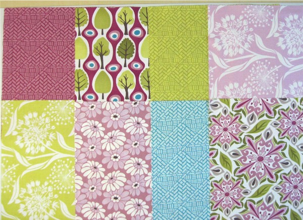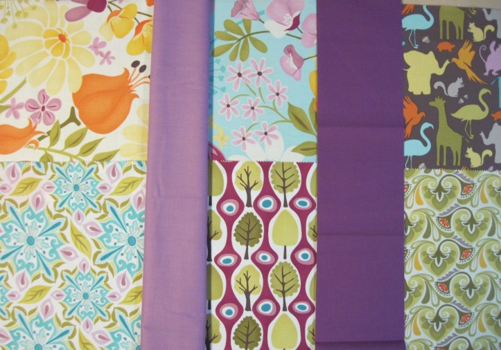 If you enjoy working within a single line, try using yardage instead of precuts. Pick a limited number of fabrics, and try some less “wow” prints. Many lines come in several different colorways, and you don’t have to include every color in your quilt. See how this selection of fabrics has a less frenetic feel than the first photo, which had a lot of large scale prints?