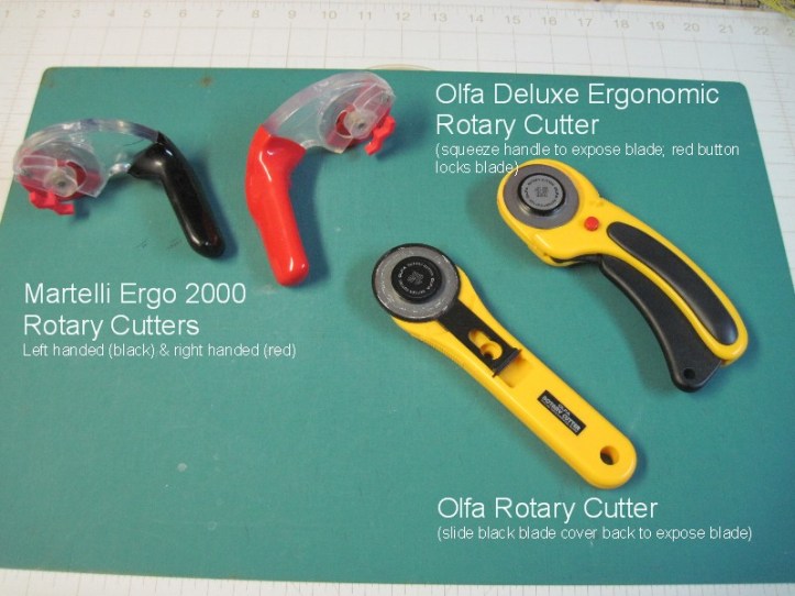 Rotary Cutter: Choose one with a good safety feature – you do NOT want to cut yourself with one of these, they’re razor sharp. Make sure you can lock the blade closed. I love my Ergo 2000, but it uses specific blades that may be more difficult for you to get. Olfa makes good ones, as does Fiskars. If you’re the only person using it, I recommend the Olfa Deluxe Ergonomic Rotary Cutter. If you’re sharing it and left/right handedness is an issue, get a straight handled one instead. As for size, if you can only get one, go with a 45mm. It’s big enough to cut through eight layers of fabric, and small enough to handle a wide curve. Don’t forget to buy replacement blades – you need to change them fairly often (and every time you do you’ll wonder why you didn’t replace the blade sooner). I’ve heard that you can actually use much cheaper carpet cutter blades, found at hardware stores.