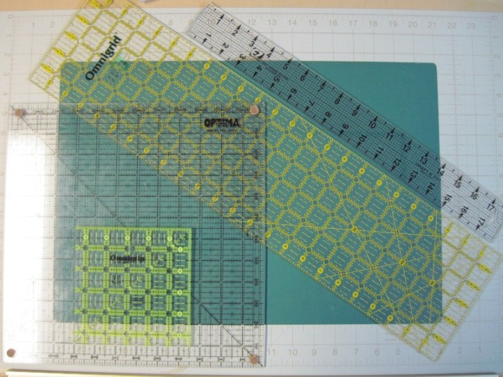 I have some acrylic rulers that have strange measurements. One in particular has the correct markings on the outside, but the lines in the middle run askew. (So if you measure from the 3″ mark on either side, you’re fine, but if you try to use the 3″ marking in the middle of the ruler, you’ll wind up 2/8 of an inch too wide.) I have two wonky rulers, and they’re both marked with coloured dots. They have uses, but I don’t use them for cutting fabric. (One is 6.5 x 6.5-inches, and is the right size around the outside, so it’s good for sizing components.)