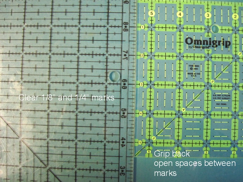 Some rulers use solid lines and others use dashed lines. I like the dashed lines so you can see the edge of the fabric when you’re measuring it. Make sure the 1/8″ marks are easy to see. When I need to measure 1/8″, I use the ruler with the full grid rather than trying to line up the 1/8″ marks every inch. Brands aren’t so important – handle some rulers and try measuring with them. Buy what feels best for you. Obviously, I have an assortment of brands, but I have heard that it’s best to use all the same brand so the measurements are consistent. Out of curiosity, I stacked three different brands of rulers on top of my marked cutting mat and they were exactly the same, so I’m not going to worry about it too much.