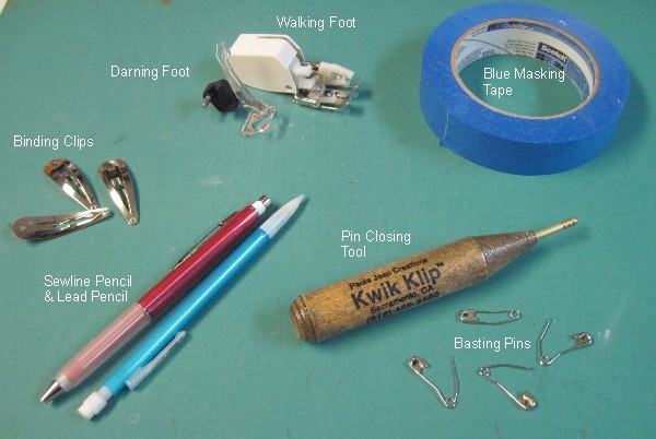 Fabric Marking Pencil: Be sure to find something with white lead for marking on dark fabric. (I just use a cheap mechanical pencil with regular lead for lighter fabrics.) There are a lot of marking tools available, but look for one that gives a sharp line, is visible on dark fabric, and erases easily. I prefer mechanical pencils because they provide a sharp line every time. I use Sewline with ceramic lead, but I see that Dritz has a mechanical pencil with ceramic lead, also.
