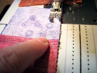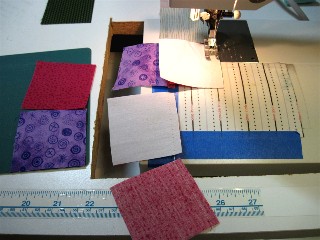 With the last set from your last block still under the presser foot, pick up the chained squares from the first block. Open the first pair of squares and place the last square for that row on the middle square.