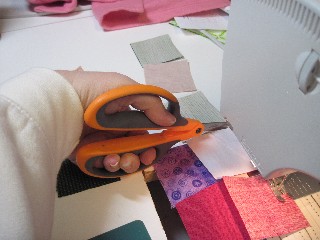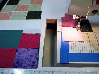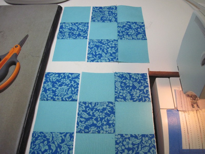 Sew those two rows together, then repeat with the remaining blocks. See how you always have a block under the presser foot? That’s chain piecing.