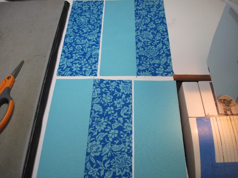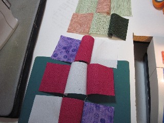Press the two sewn pieces to one side (or open, if you prefer). If you press to the side, press to the same fabric on each piece. In this case, I pressed to the print. Place the center pieces on one side of each sewn segment so you have alternating fabrics.