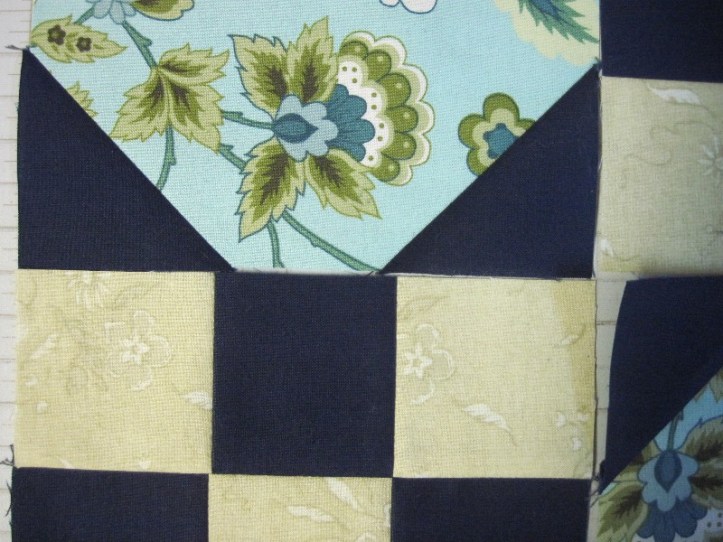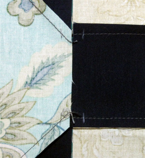 Sew the blocks together, being especially careful as you approach the points where the seams should align. You don’t want to sew directly ON the line; instead sew just a hair to the outside. I could have gone a bit further to the outside in this example.