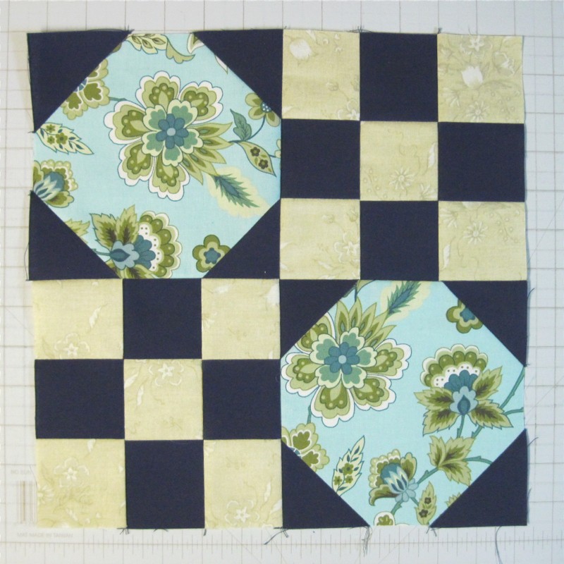 If you are using the “white and bright” illustration as a fabric placement guideline, the nine patch units in this block are blue. You may choose to make both nine patches from the same fabric, or make them from several different fabrics.