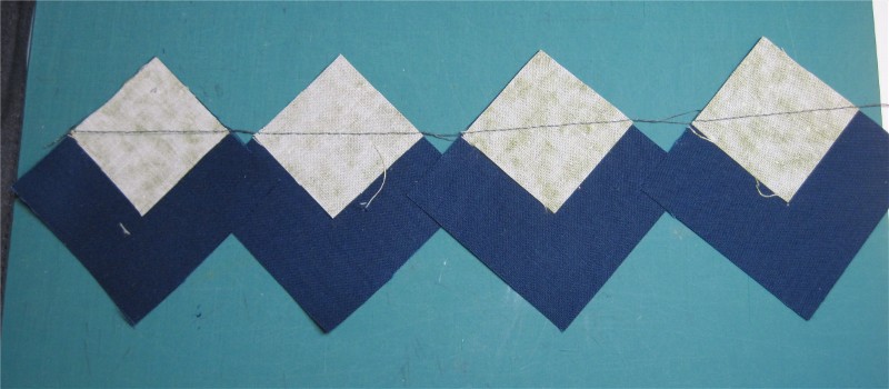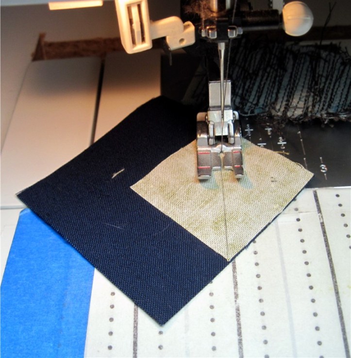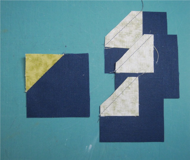 If you'd like, draw a diagonal line on the back of the 1" squares for your sewing line. Place one 1 1/2" square on one corner of each background square.