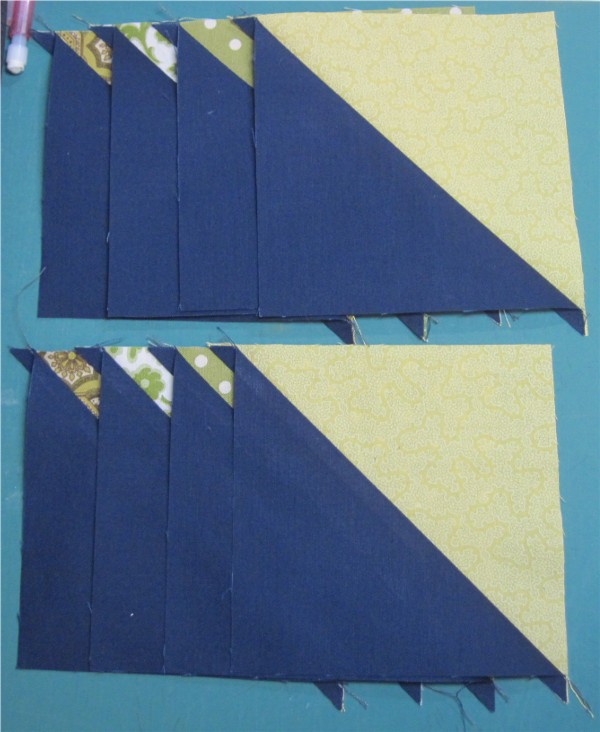 You will now have eight background/block HSTS, two block/block HSTS, and four extra block fabric triangles.