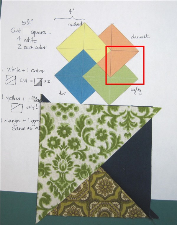 Next, take one of your background/block fabric HST units and find the triangle that, laid over the HST, creates the correct unit. Again, your labeled block will come in very handy here. As you can see in the photo below, I labeled my fabrics “mustard,” “damask,” “ugly” and “dot.” The red square shows which unit the fabric will replicate.