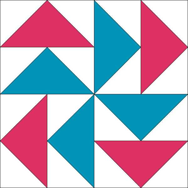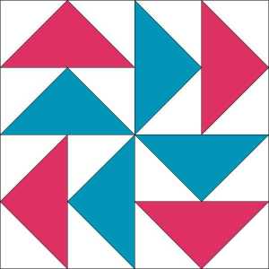 Our next block uses Flying Geese units and finishes at 12″ (12 1/2″ unfinished). The Dutchman’s Puzzle block (which I incorrectly referred to as the Flying Dutchman in the Skill Builder post) is sort of a pinwheel within a pinwheel. Color placement can create all sorts of different looks, but for this block we’ll use two block fabrics and the background. If you’re following the white and bright layout, it’s red and aqua.
