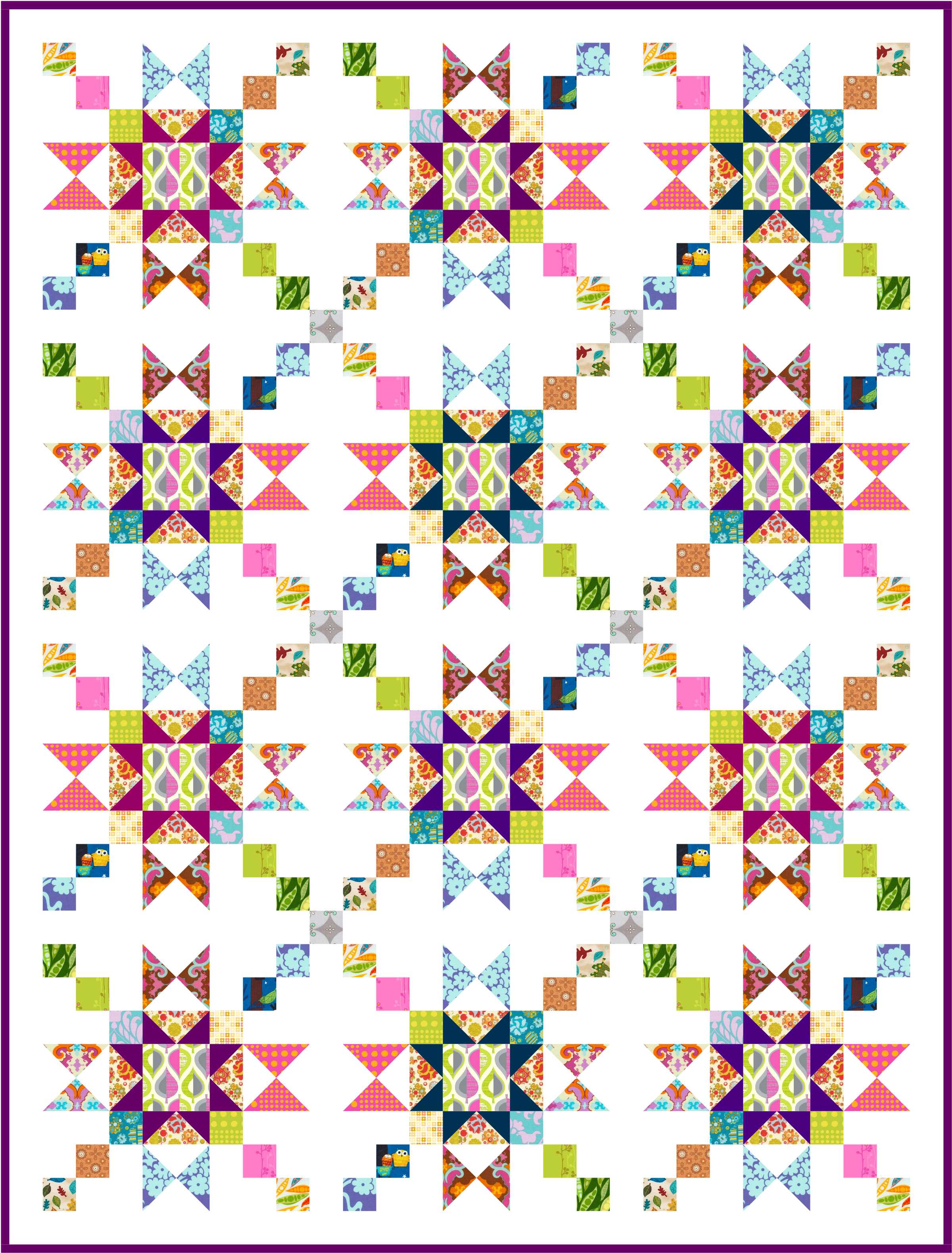 We decided this quilt would look good scrappy, and we chose colors based on what we thought the recipient would like. Here’s an illustration of the whole quilt in the chosen colorway: