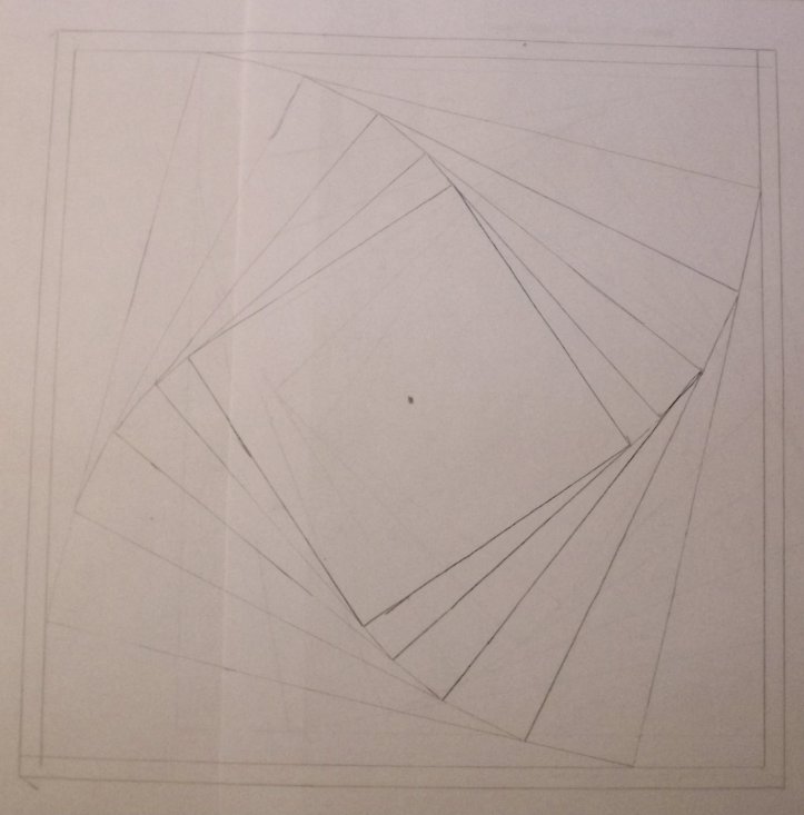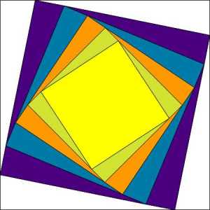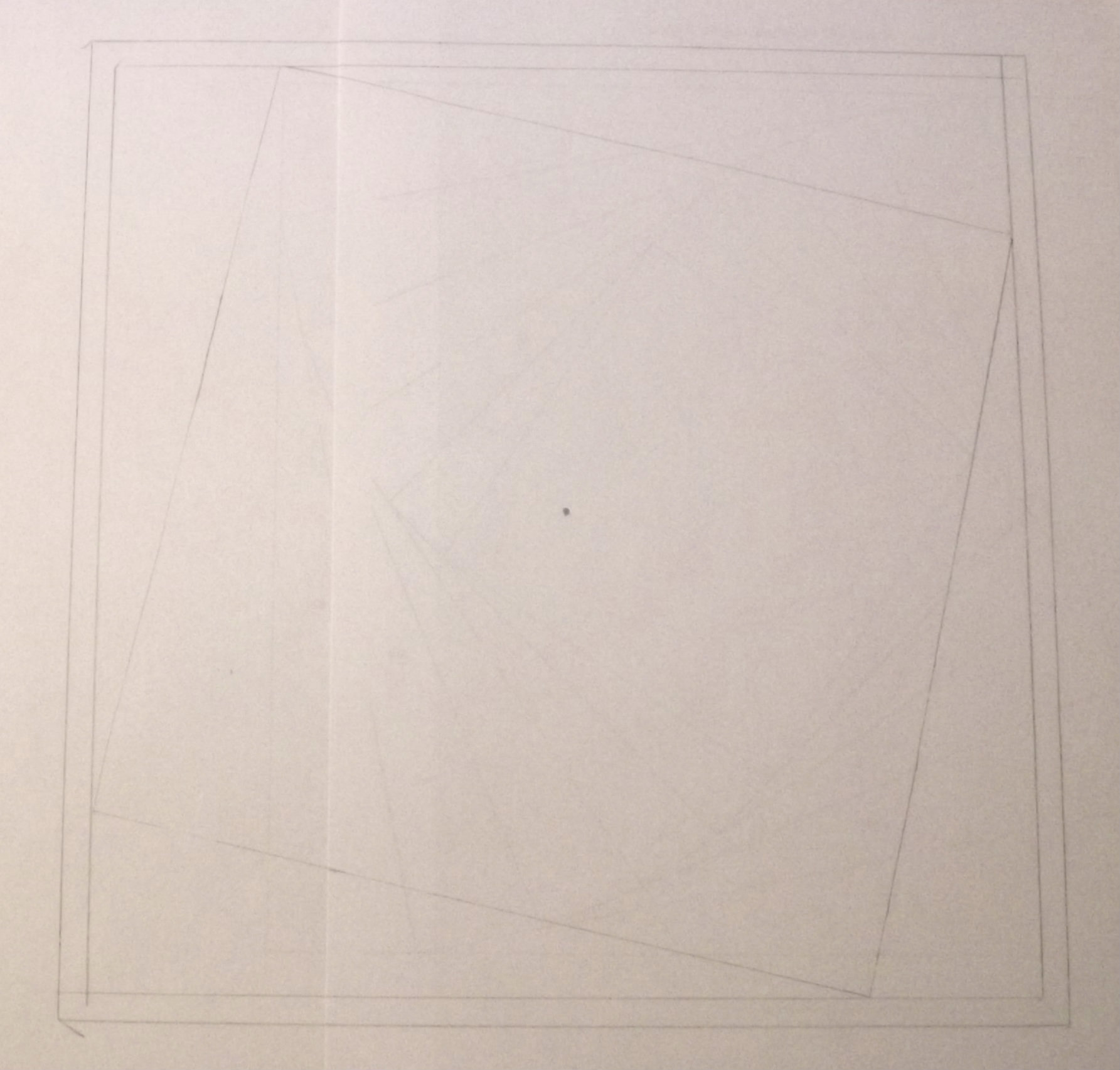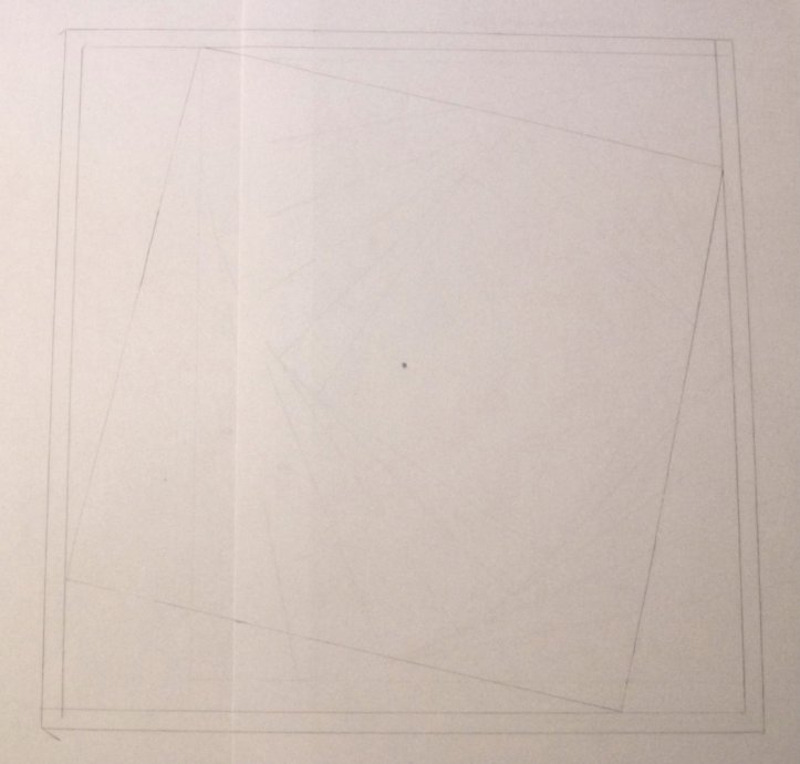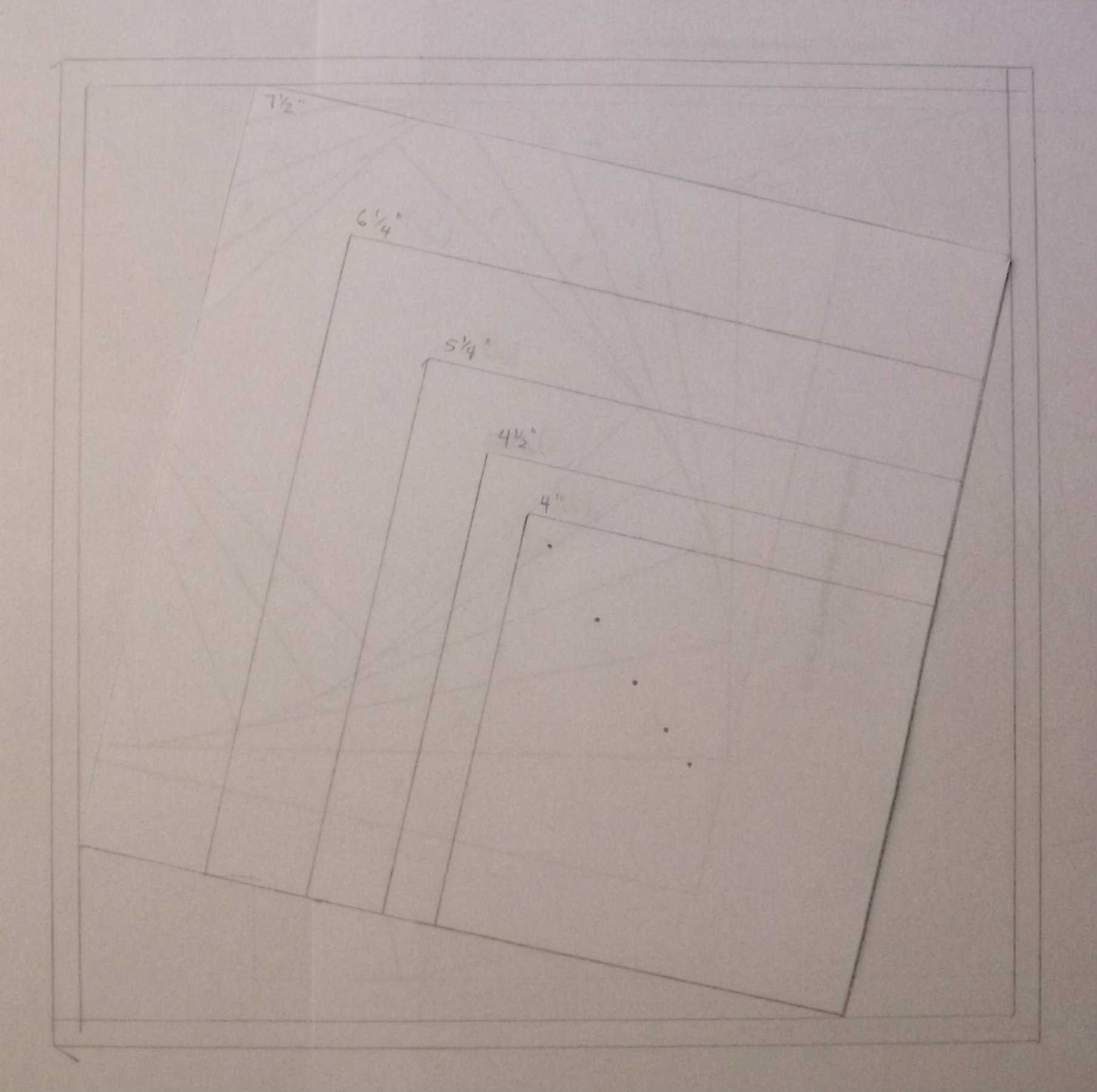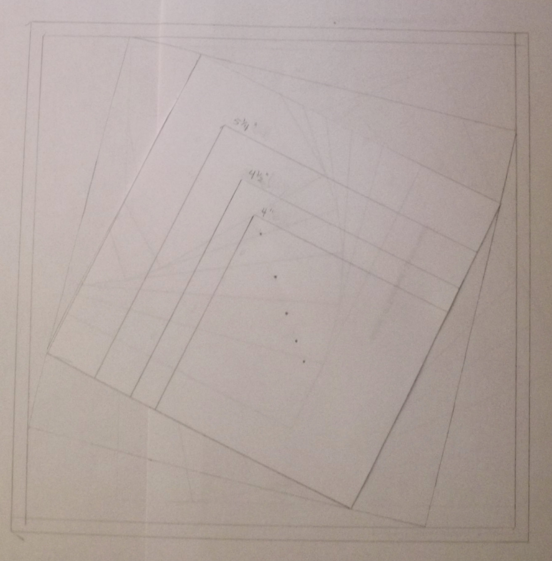 Now cut the square down to the 6 1/4″ mark, put the pin through the new center point and stick it in the center of the 9″ square, rotate until the corners just touch the edges of the 7 1/2″ square you just drew, and trace.