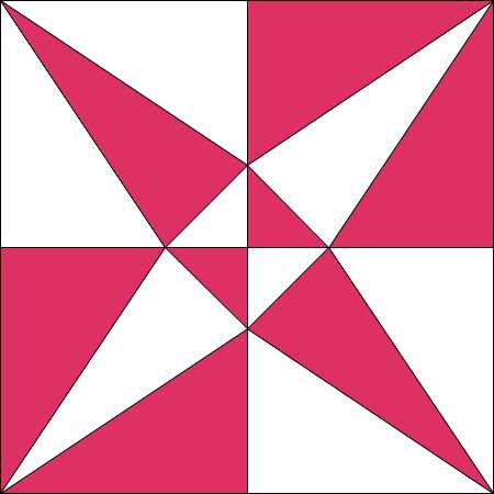 This block is also called Crossed Kayaks. If you’re following the white & bright layout, it is pink and white. It is another foundation pieced block, this time one that requires four separate pieces that are joined together. Jeanne of Grey Cat Quilts used this block in her Skill Builder Foundation Piecing post, so you could follow along on this post if you’d like. Her post demonstrates the more common method of foundation piecing that sews through the paper. She also shows how to join multiple paper pieced sections. If you prefer to use the freezer paper method, check out my Skill Builder post.